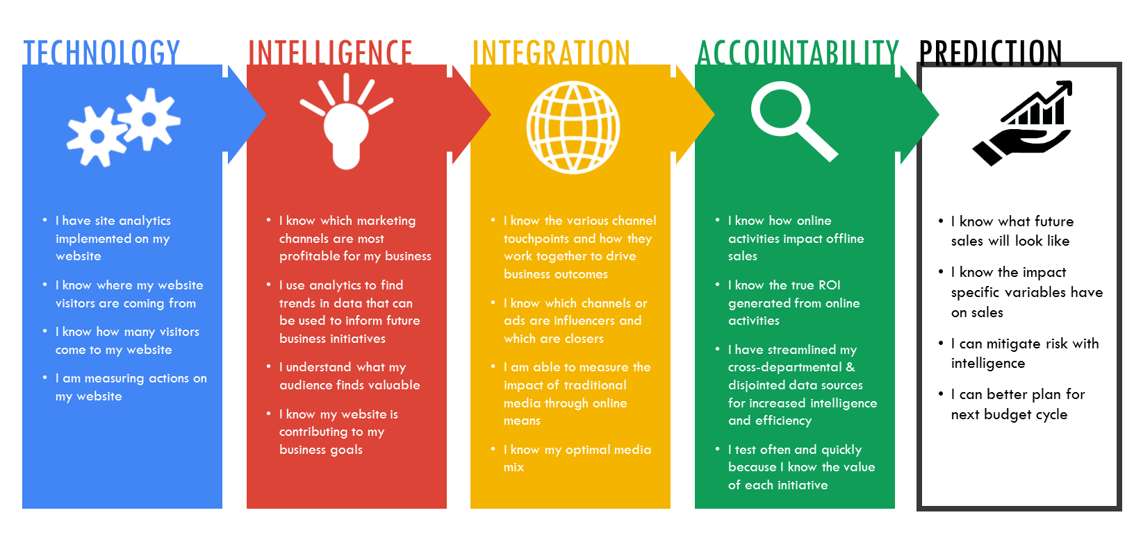 There are many levels of interpretation for website analytics. The goal is to advance your interpretation from the basic implementation and reading/understanding the information to ultimately being able to predict future business metrics based on patterns through the information. Most higher ed organizations I know are in the basics stages of interpretation. We have a general idea of overall traffic and audience data – but we can’t always explain why the data is the way it is. When it comes down to it – pageviews, referring social media sites, referring landing pages, new vs. returning visitors, bounce rates, keywords, and all of the other information – don’t really mean anything unless you can connect it with your business marketing objectives.