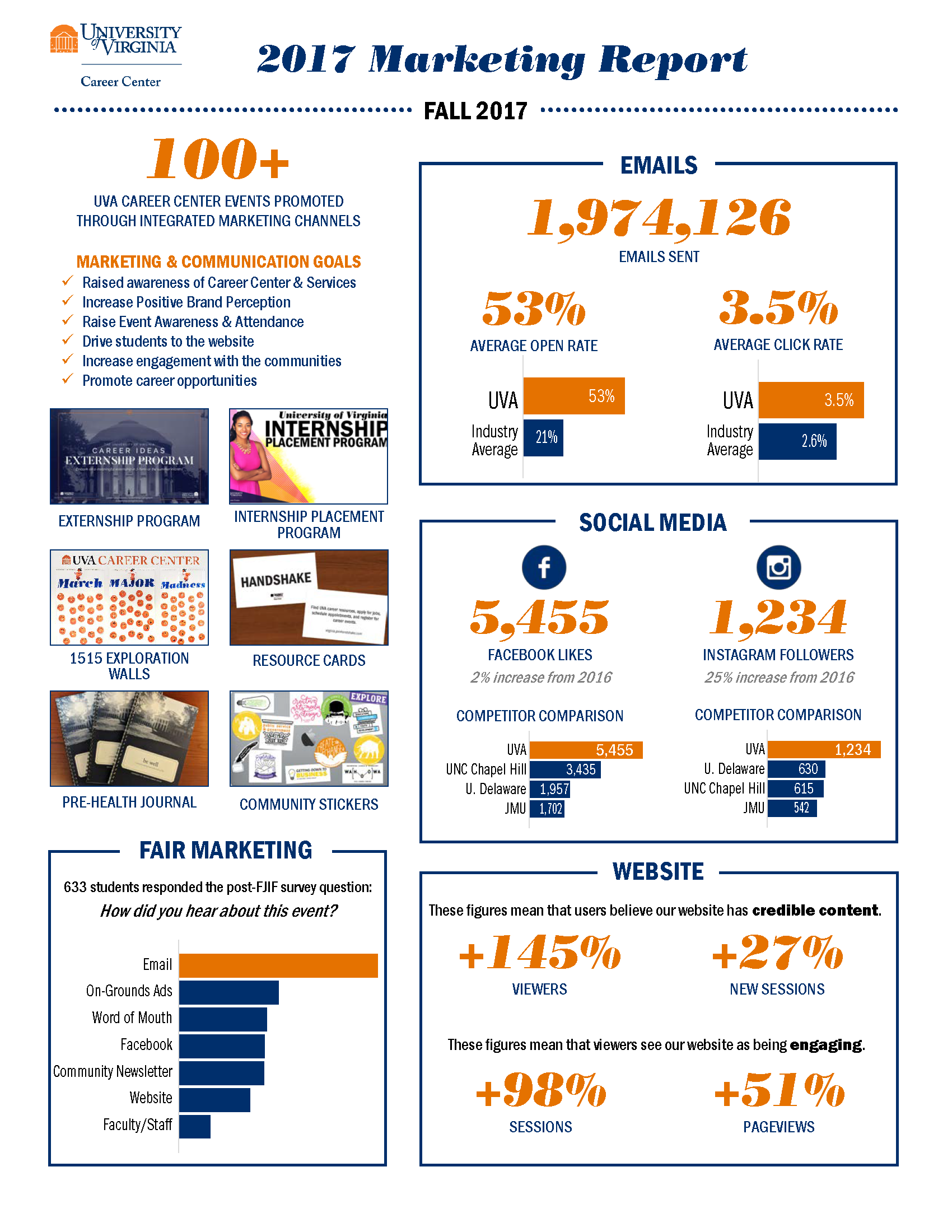 Current performance was curated from Google Analytics, Facebook Insights, Instagram Reporting, Twitter Reporting, YouTube Analytics, App Dashboard, customer surveys, MailChimp and other email platforms, Foresee Data, and more. The reports were tailored for the audience – some demonstrate overall marketing strategies, and others segmented for specific brands.