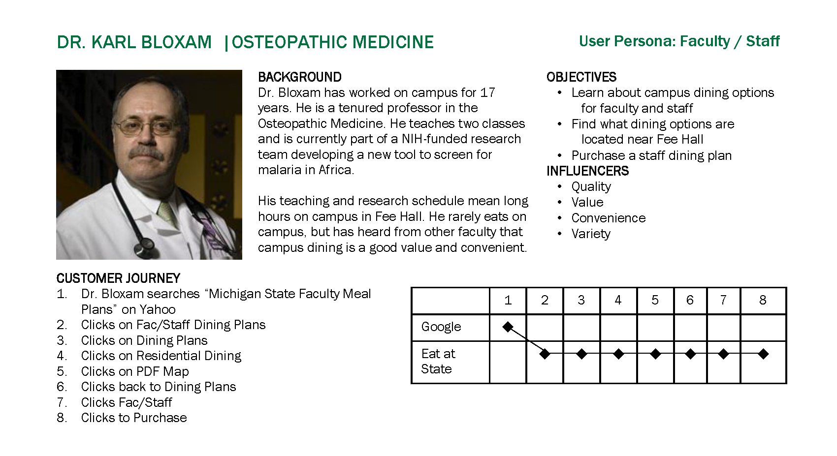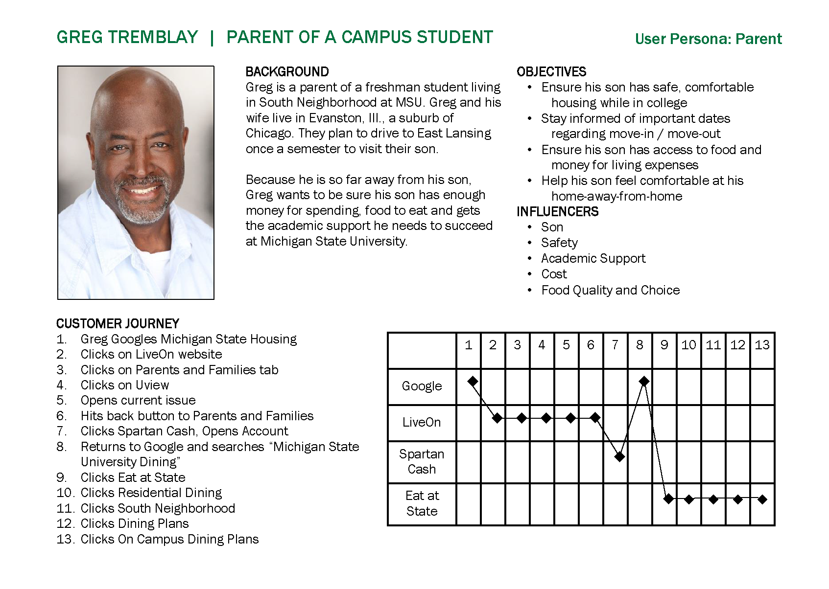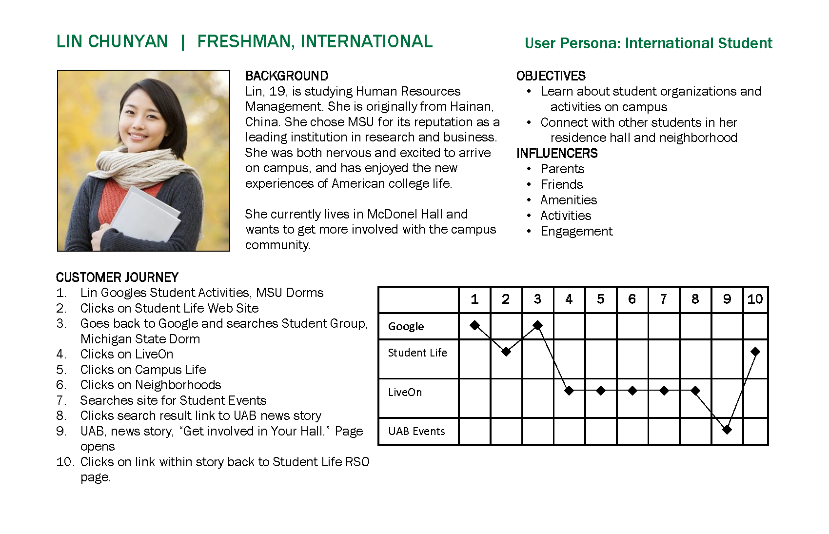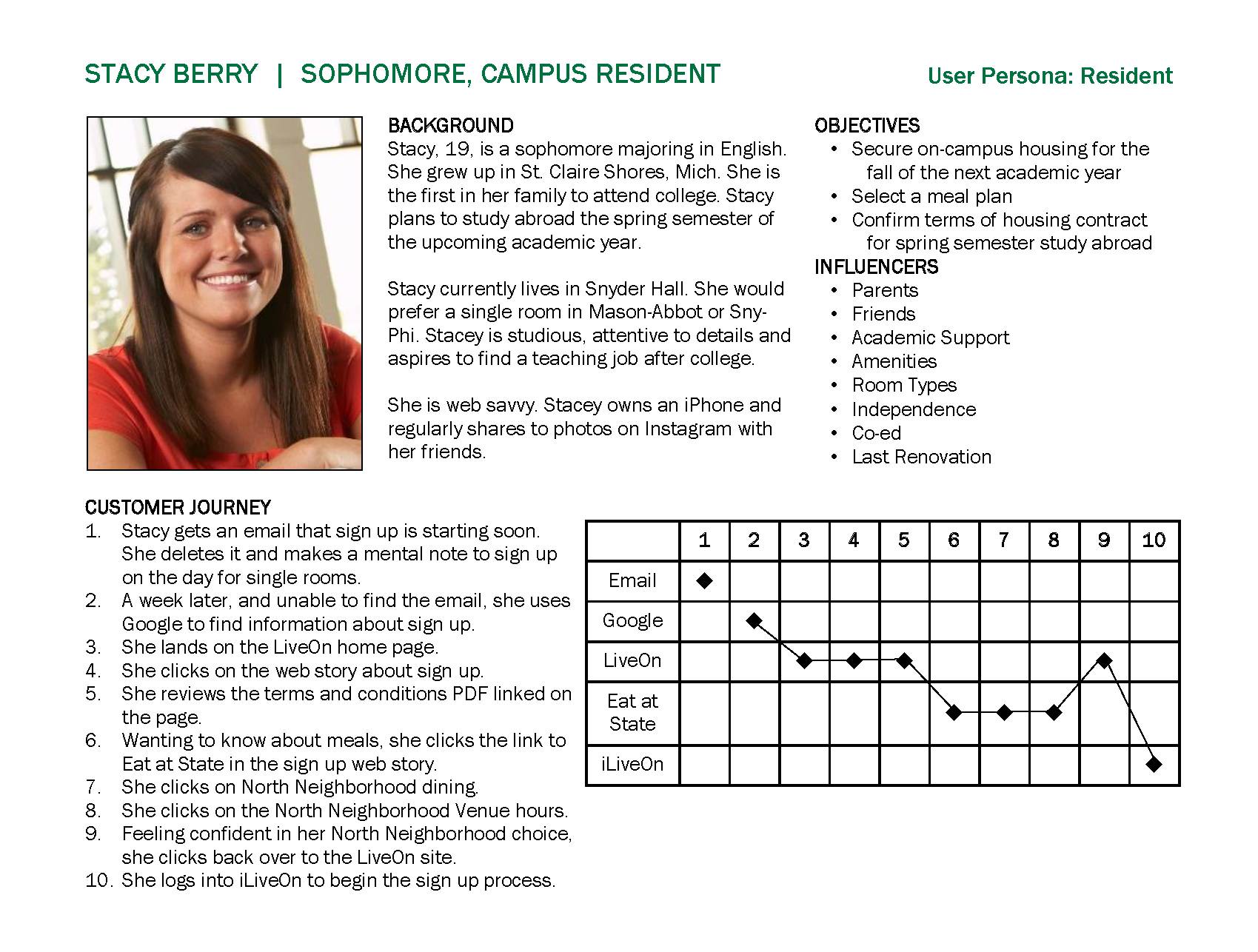 The user personas were developed to demonstrate how difficult it was for a website visitor to navigate through 40+ websites to learn about and register for campus services.